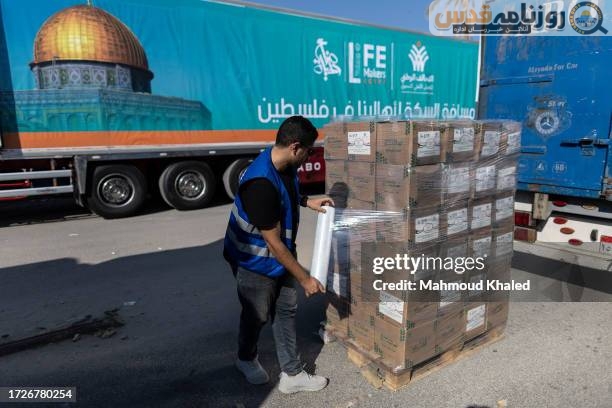 NORTH SINAI, EGYPT - OCTOBER 16: Volunteers load food and supplies onto trucks in an aid convoy for Gaza on October 16, 2023 in North Sinai, Egypt. The aid convoy, organized by a group of Egyptian set off on Saturday 14th from Cairo for the Gaza-Egypt border crossing at Rafah. On October 7th, the Palestinian militant group Hamas launched a surprise attack on border communities in southern Israel, spurring the most violent flare-up of the Israel-Palestine conflict in decades. Israel launched a vast bombing campaign in retaliation and has warned of an imminent ground invasion. (Photo by Mahmoud Khaled/Getty Images)