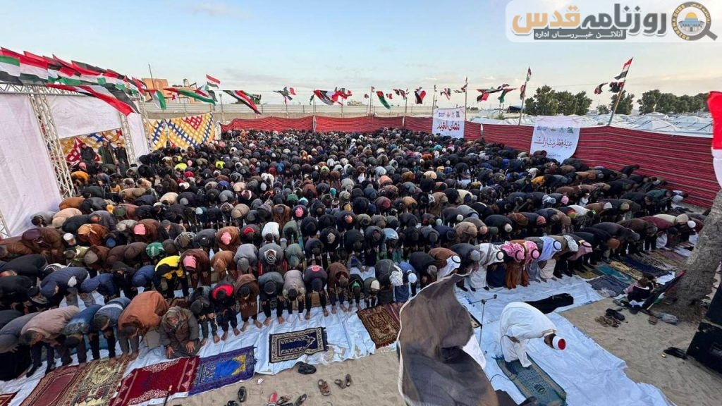 غزہ – (روزنامہ قدس ـ آنلائن خبر رساں ادارہ) غزہ کی پٹی کے مختلف علاقوں میں جمعہ کی صبح دسیوں ہزار فلسطینیوں نے عید الفطر کی نماز ادا کی۔ یہ روح پرور مناظر تباہ شدہ مساجد کے ملبے اور بے گھر ہونے والے مظلوم فلسطینیوں کے خیموں کے قریب کھلے میدانوں میں دیکھے گئے جہاں عید کی تکبیرات کی گونج میں ایمانی جذبہ اور قابض دشمن کی سفاکیت کے نشانات ایک ساتھ نمایاں تھے۔