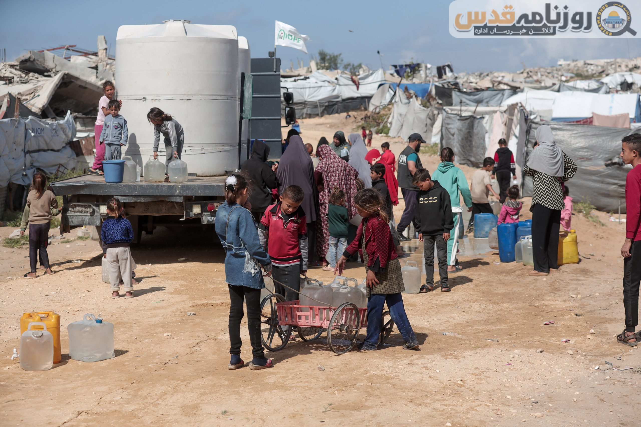 العربی الجدید اخبار کے مطابق غزہ شہر کے وسط میں قائم بے گھر افراد کے کیمپوں میں سینکڑوں فلسطینی روزانہ پانی کے ٹرکوں کے سامنے قطاروں میں کھڑے ہو کر اپنے چھوٹے گیلن بھرنے کی کوشش کرتے ہیں۔ یہ ایک انتہائی تھکا دینے والا عمل ہے جو انہیں اپنی کم از کم ضروریات پوری کرنے کے لیے دن میں کئی بار دہرانا پڑتا ہے۔
