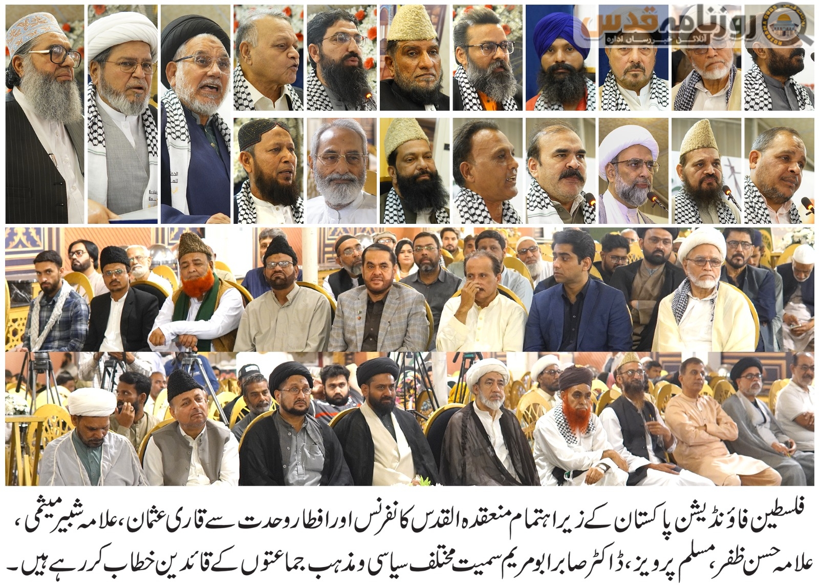 فلسطین فائونڈیشن پاکستان کے زیر اہتمام القدس کانفرنس اور افطار وحدت سے علماء، ذاکرین، خطباء، مشائخ، دانشوروں، اساتذہ، وکلاء، تاجر برادری اور طلبہ رہنمائوں سمیت سماجی و انسانی حقوق کی تنظیموں کے رہنمائوں کا خطاب