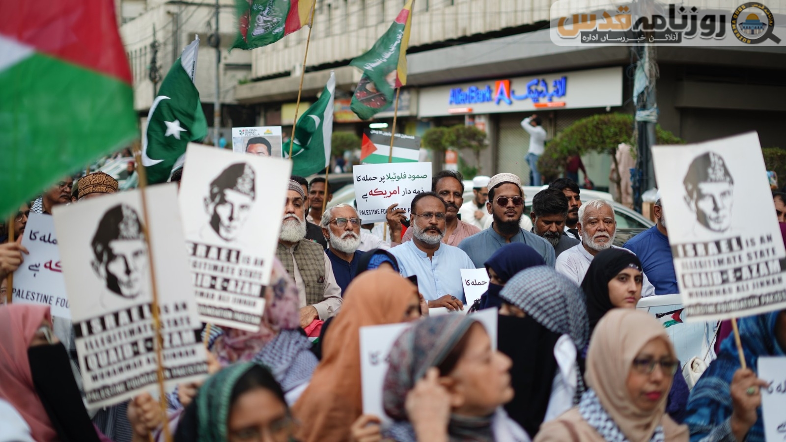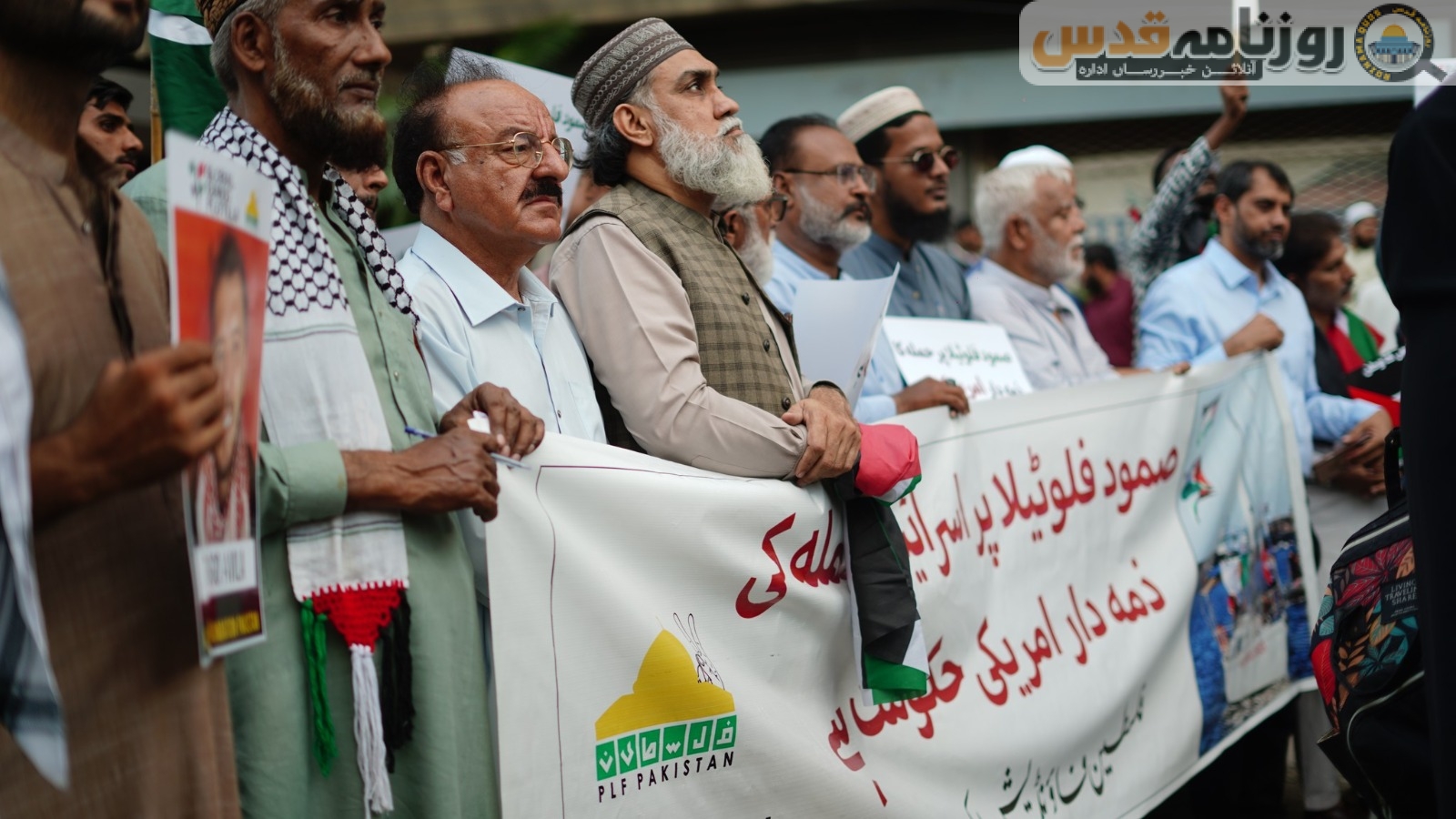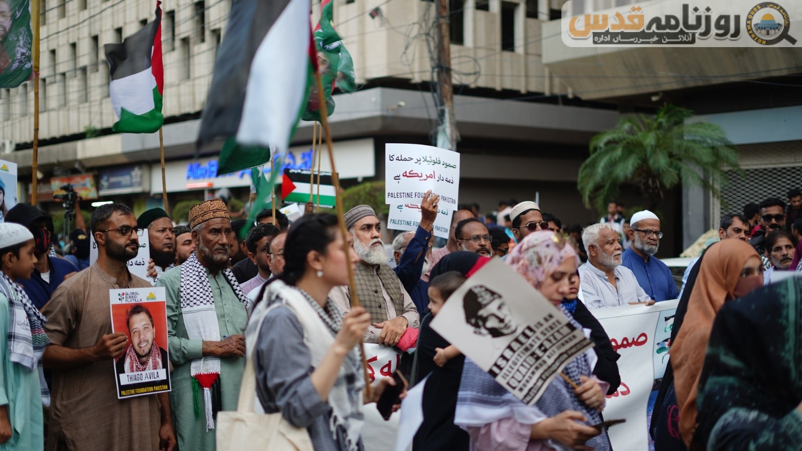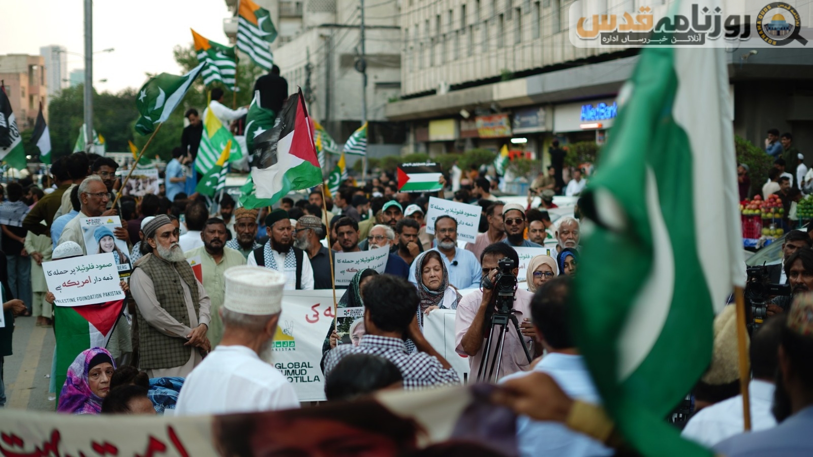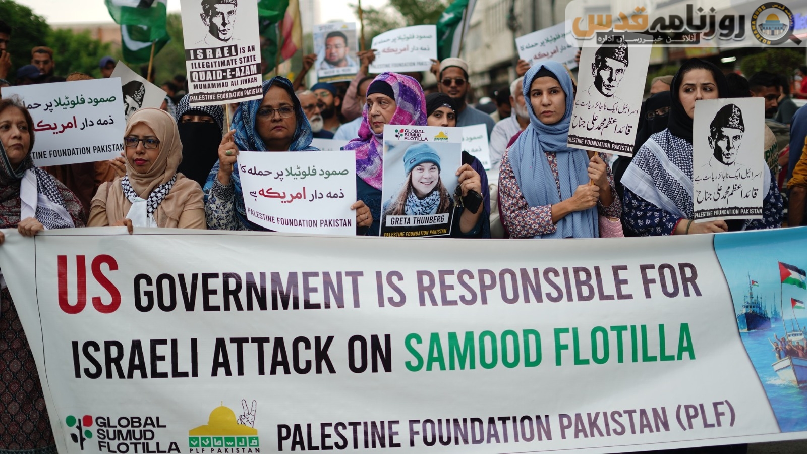 (روزنامہ قدس ـ آنلائن خبر رساں ادارہ) فلسطین فائونڈیشن پاکستان کے زیر اہتمام کراچی پریس کلب کے سامنے صمود فلوٹیلا پر اسرائیلی حملہ اور جارحیت کے خلاف احتجاجی مظاہرہ کیا گیا جس میں سیکڑوں مرد و خواتین نے شرکت کی۔